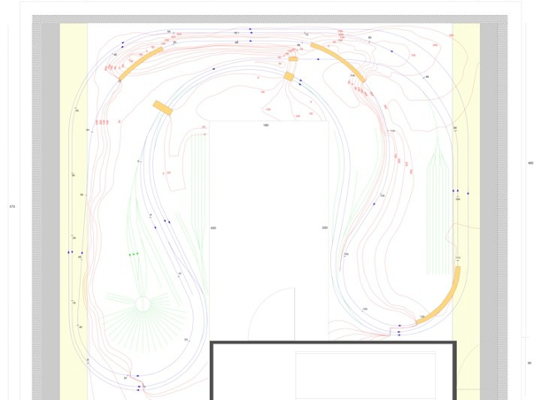 Afin de donner une meilleure idée du projet, voici le plan du réseau. Les voies de circulation sont en bleu, les voies de garage et de service en vert. Le relief est indiqué par les courbes de niveau en rouge. Les éléments oranges sont des ponts. On trouve deux viaducs dans le haut à gauche et à droite du plan. Le passage supérieur en bas à droite du plan n'est pas visible par les spectateurs. Il se trouve sous une montagne. Les autres ponts de petite tailles dans la partie haute du plan permettent le passage du torrent. Enfin le pont orange à gauche est un pont permettant le passage inférieur de la route sous les voies à l'entrée de la gare. Les cotes d'altitudes sont en millimètres par rapport au niveau 0 correspondant au voies dans les gares. Les voies sont toutes à des altitudes positives tandis que le décors peut descendre jusqu'à