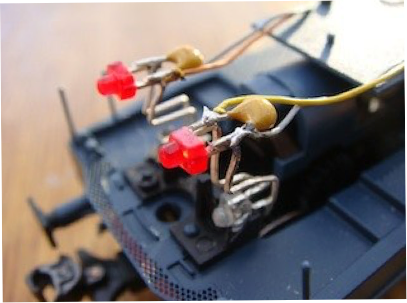 Le système d’éclairage d’origine fait appel à des leds cms fabriquées spécialement pour cette locomotive : quatre leds (2 blanches, et 2 rouges) sont directement intégrées sur un circuit imprimé. Les jonctions sont à l’air ce qui les rend particulièrement vulnérables. De plus cela rend impossible de revenir à mon schéma classique qui évite de voir s’allumer légèrement les feux rouges en marche avant et les blancs en marche arrière.