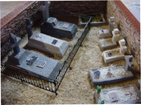 C’est plutôt rare de voir des cimetières représentés sur les réseaux miniatures et pourtant chaque village en possède un ! C’est en fait un élément de décor qui parle au visiteur car, par son aspect, il est unique et familier. La variété des tombes en fait aussi un élément sympathique à reproduire. Il y a des tombes modeste, d’autres imposantes avec du granit, d’autre pratiquement à l’abandon avec juste parfois un simple monticule de sable. On trouve aussi autant de modèles de croix que de tombes. Comme nous sommes fin des années 50 et dans un petit village, la plupart des tombes sont modestes et constituées uniquement d’un entourage en ciment rempli de petits cailloux blancs. Le granit poli n’était pas aussi répandu que de nos jours. Le niveau de vie des morts a bien augmenté !