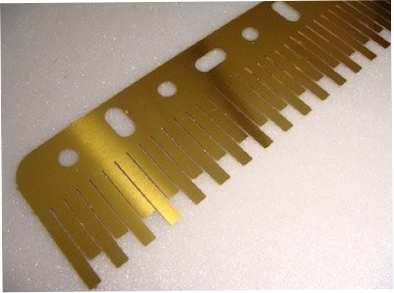 À noter que j’ai d’abord fait un essai de gravure d’un peigne similaire dans du bronze phosphoreux présensibilisé disponible sur le site de Micro-modèle. Lors d’un échange téléphonique, le propriétaire du magasin m’avait prévenu que la gravure de ce métal est particulièrement difficile et qu’il fallait vraiment aider en agitant le bain de gravure. En fait je n’ai rien obtenu du tout : le bronze n’a pas semblé vraiment attaqué par le persulfate d’ammonium même à 50°C et après plus d’une heure dans le bain ! Sans doute faut-il utiliser un autre agent de gravure qui attaque le bronze. Je n’ai pas insisté et j’ai finalement réalisé mes peignes en laiton. Si ce métal s’avère trop mou je peux tenter le maillechort.